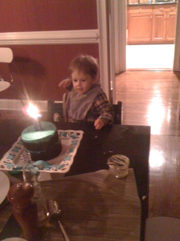 20111108-202915.jpg Darwin got to have his birthday cake this evening! He was very excited by it and did lots of clapping! Again, he tried to get near the flame of the candle, so there wasn’t too much candle blowing out going on. I just made a chocolate cake with a blue, cream cheese filling, I’m saving his fancy cake for his birthday!