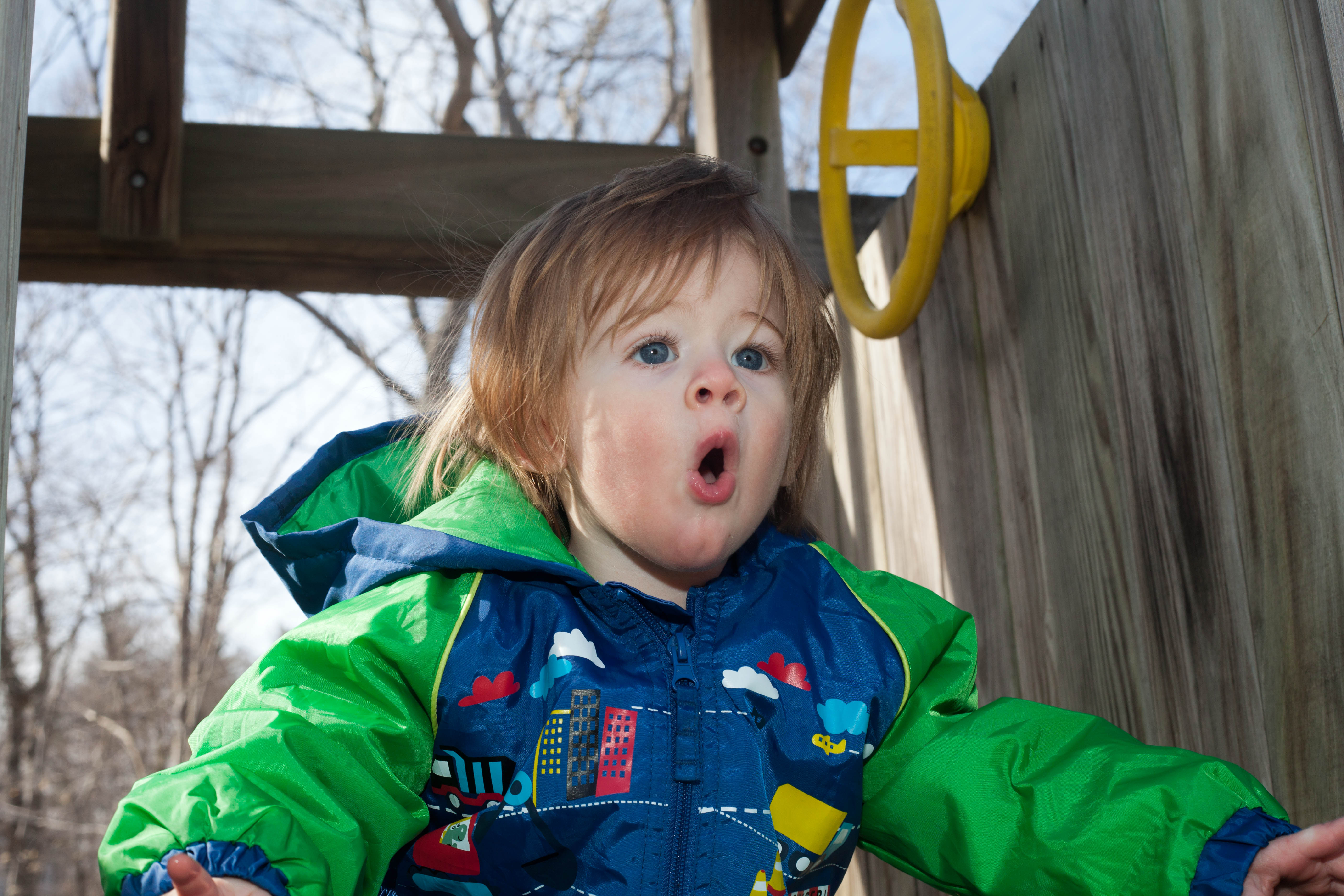 Darwin is now an expert on the slide. We help him walk up the steps and then walks round, positions himself and pushes himself down, we then catch him half way down. He loves sitting on the tyre swing with daddy and gives him really big hugs!