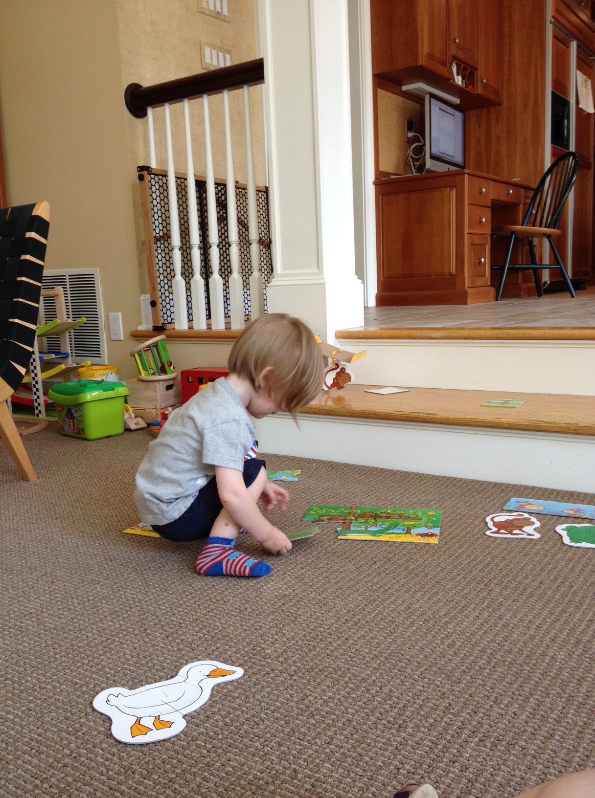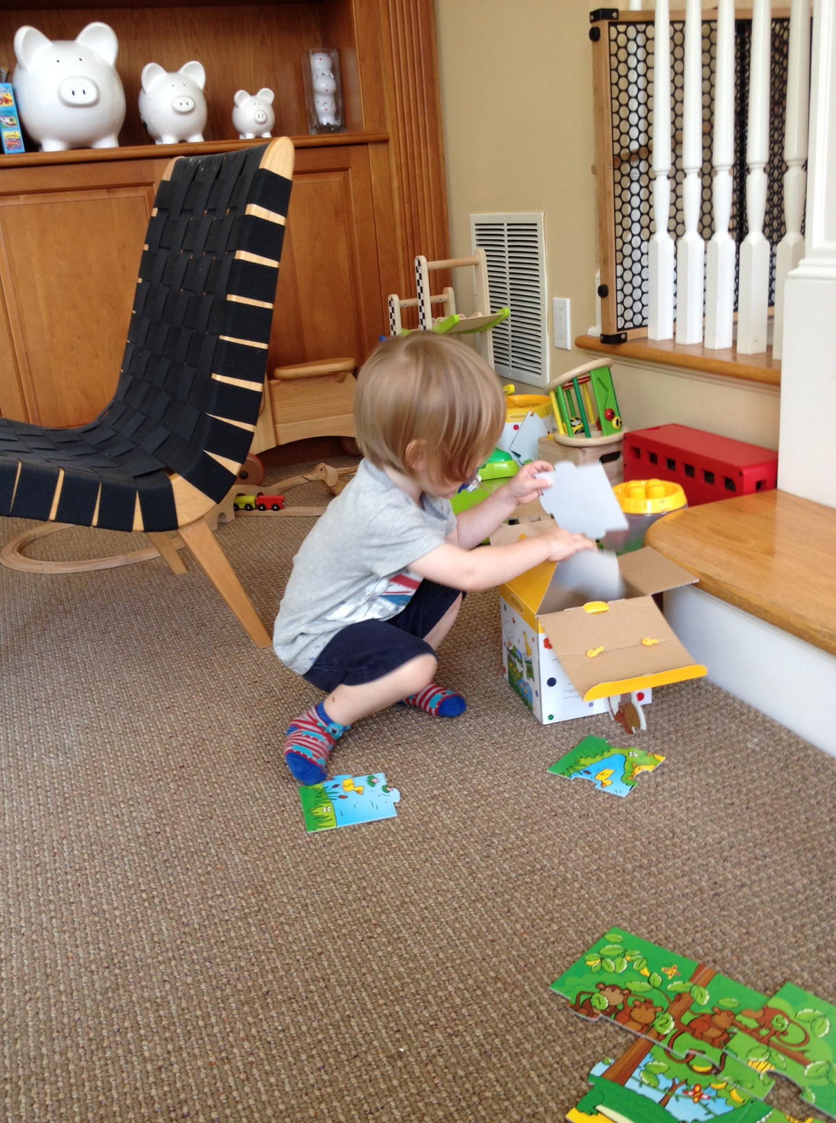 Jigsaws are Darwin’s favorite game to play! We empty the box out, you give him one piece of an animal and he finds the other pieces and we put them together. He’s really good at them and then when he’s finished playing he says goodbye to each animal and puts them back in the box!
