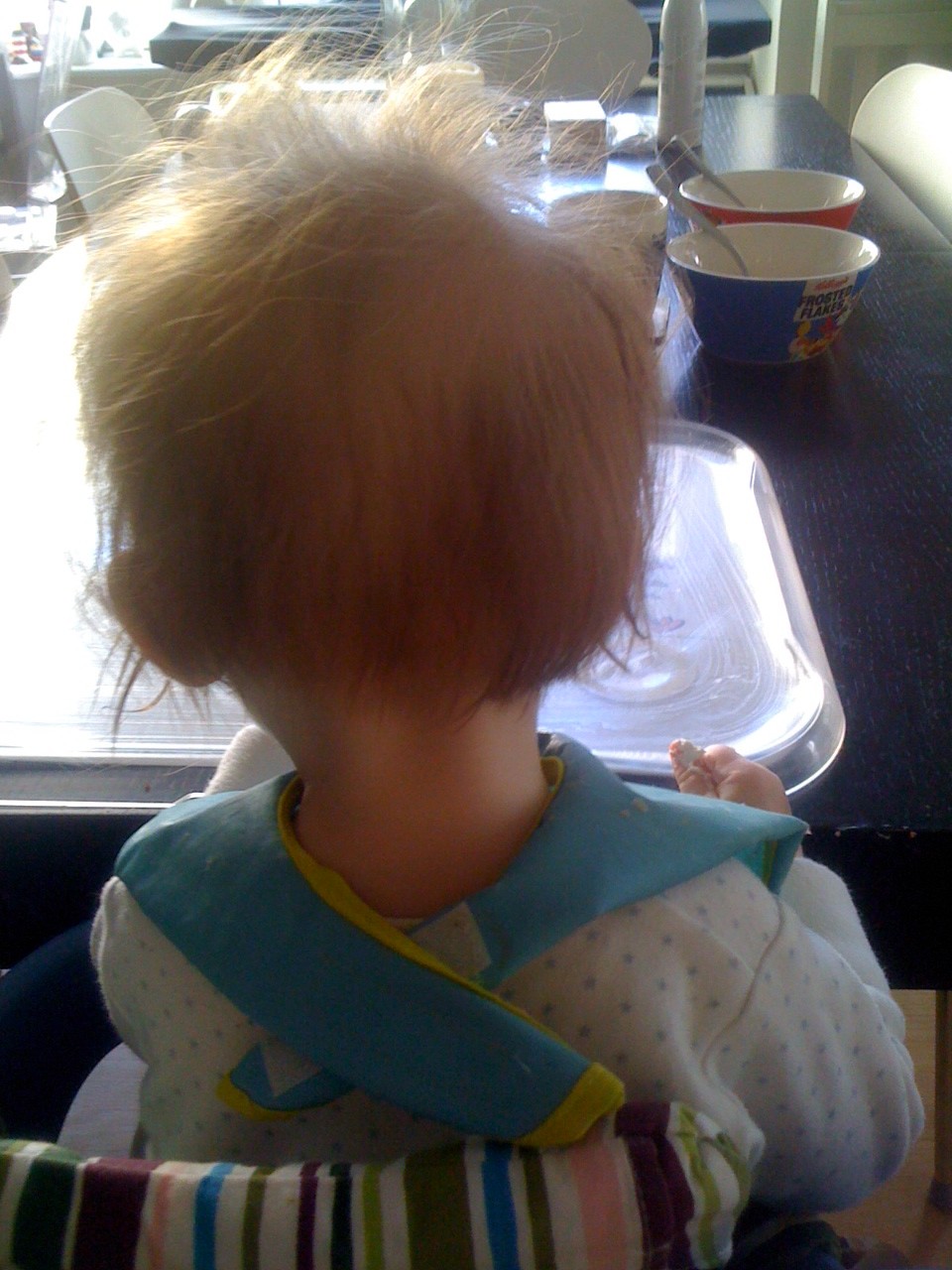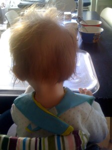 Yesterday I braved it and gave Darwin a haircut!! After much debate with Daddy and him refusing to tell me where the scissors were, I waited for him to leave for work and did it! Poor Darwin was constantly getting food stuck in his hair and it was long enough to plait! So I changed his diaper, feed him breakfast and gave him a toy to distract him and then cut! I was actually very emotional about it and quite scared that he would move and I’d hurt him or the cut would be very uneven. I only had the heart to cut the back, he still has his crazy hair at the front, but now it’s nice and neat at the back and he had no idea I’d done it. His locks are now safely stored in his memory box!